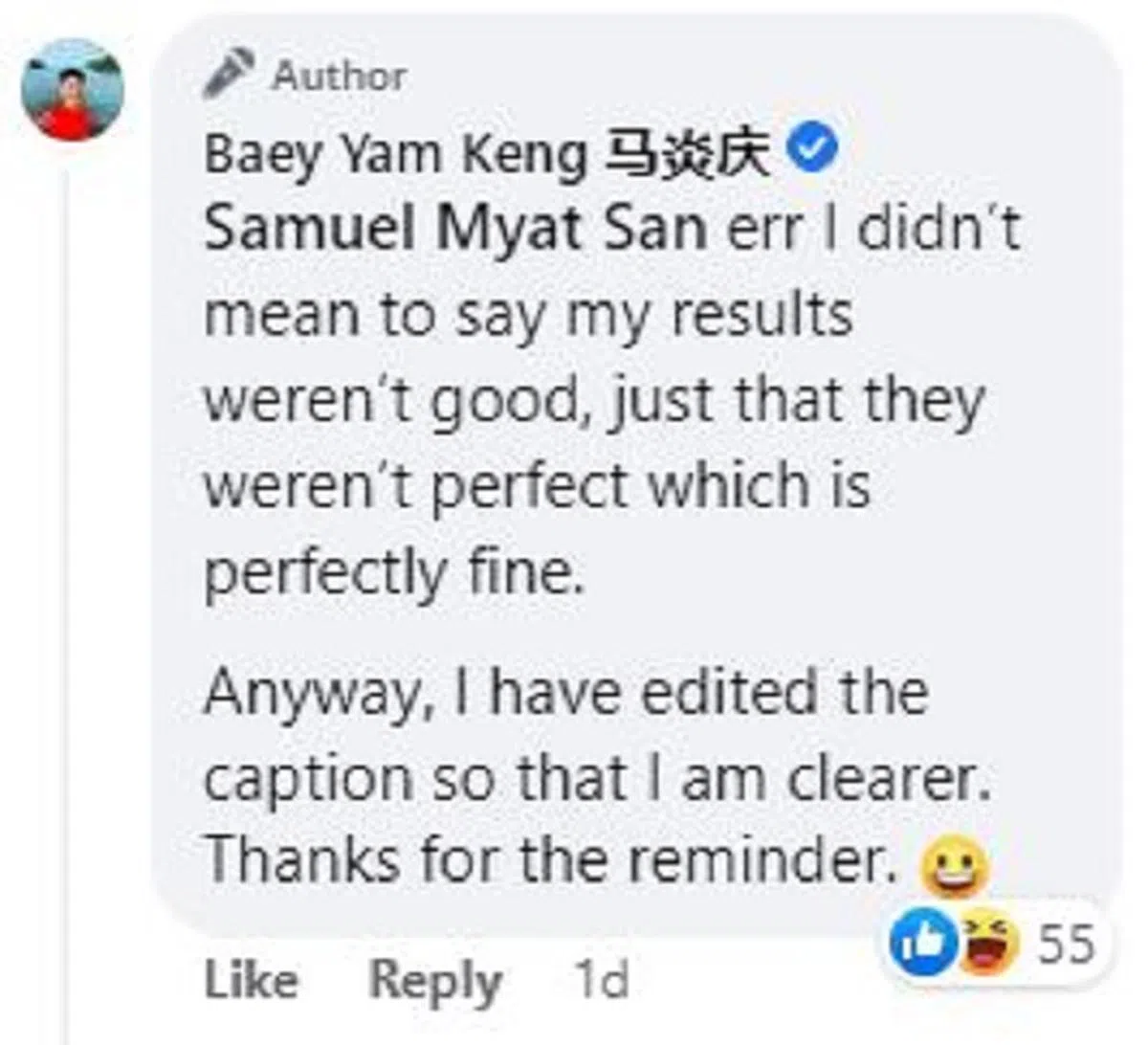 马炎庆也同样回复了Samuel,并重申“没说成绩不好只是不够完美”的立场。