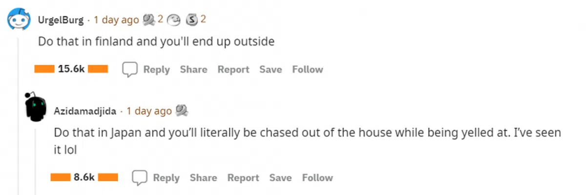有网民就警告说,如果到芬兰人和日本人的家作客时穿鞋进门,你肯定会被直接赶出门,而且会被对方破口大骂。