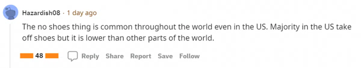 不过也有人表示,问题的关键不在于亚洲人爱脱鞋进屋,而是美国人都喜欢穿鞋入屋。