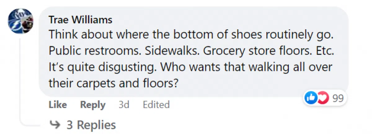 有人说,想想鞋底常接触到的地方?公共厕所,人行道,超市地板等。真的很恶心,谁想让它在自己的地毯和地板上到处走?