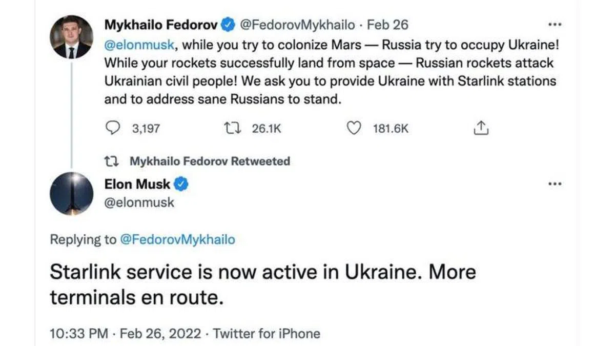 由于俄乌战事直接导致乌克兰的互联网基础设施受到影响,尤其是在起初战斗最激烈的乌克兰南部和东部地区。费奥多罗夫于是在2月26日于推特上恳请美国太空探索技术公司(SpaceX)首席执行官埃隆‧马斯克(Elon Musk)为正处于危难中的乌克兰提供星链服务。