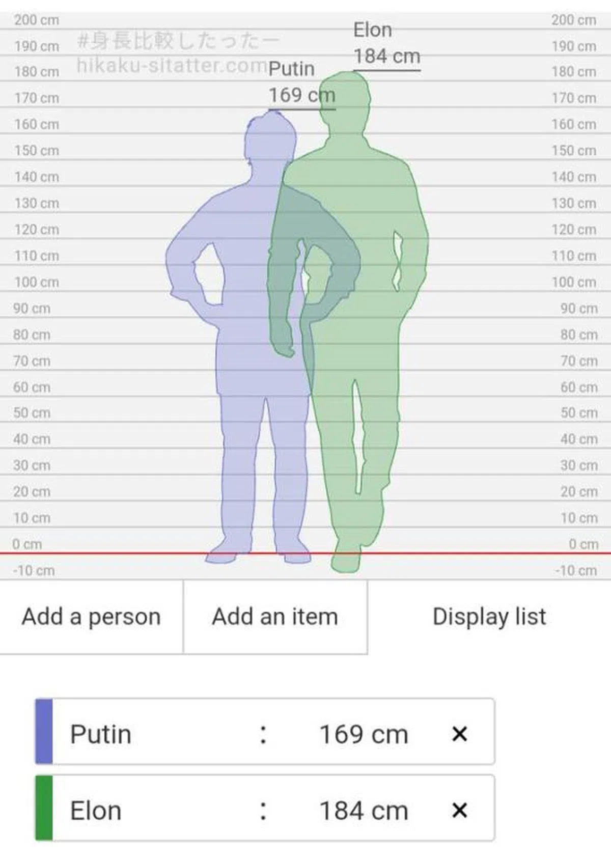 有网民在对比了两人的身高差距——184公分(马斯克)对垒169公分(普京)后,作出马斯克会在10秒内大获全胜的结论。