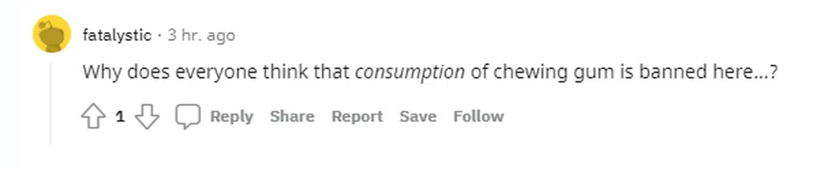 事实上,这个梗不太正确。有网友就纳闷,为什么大家都以为新加坡禁吃口香糖:
