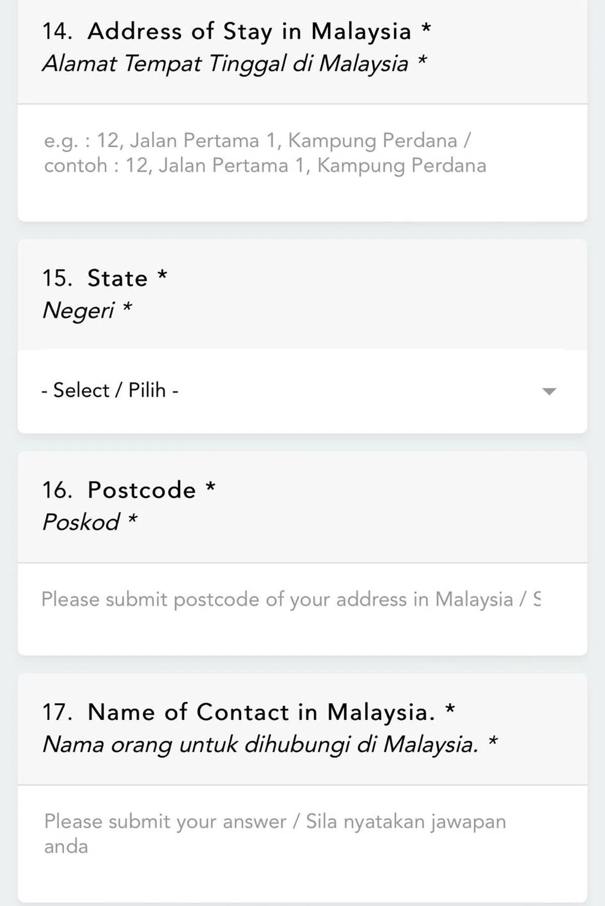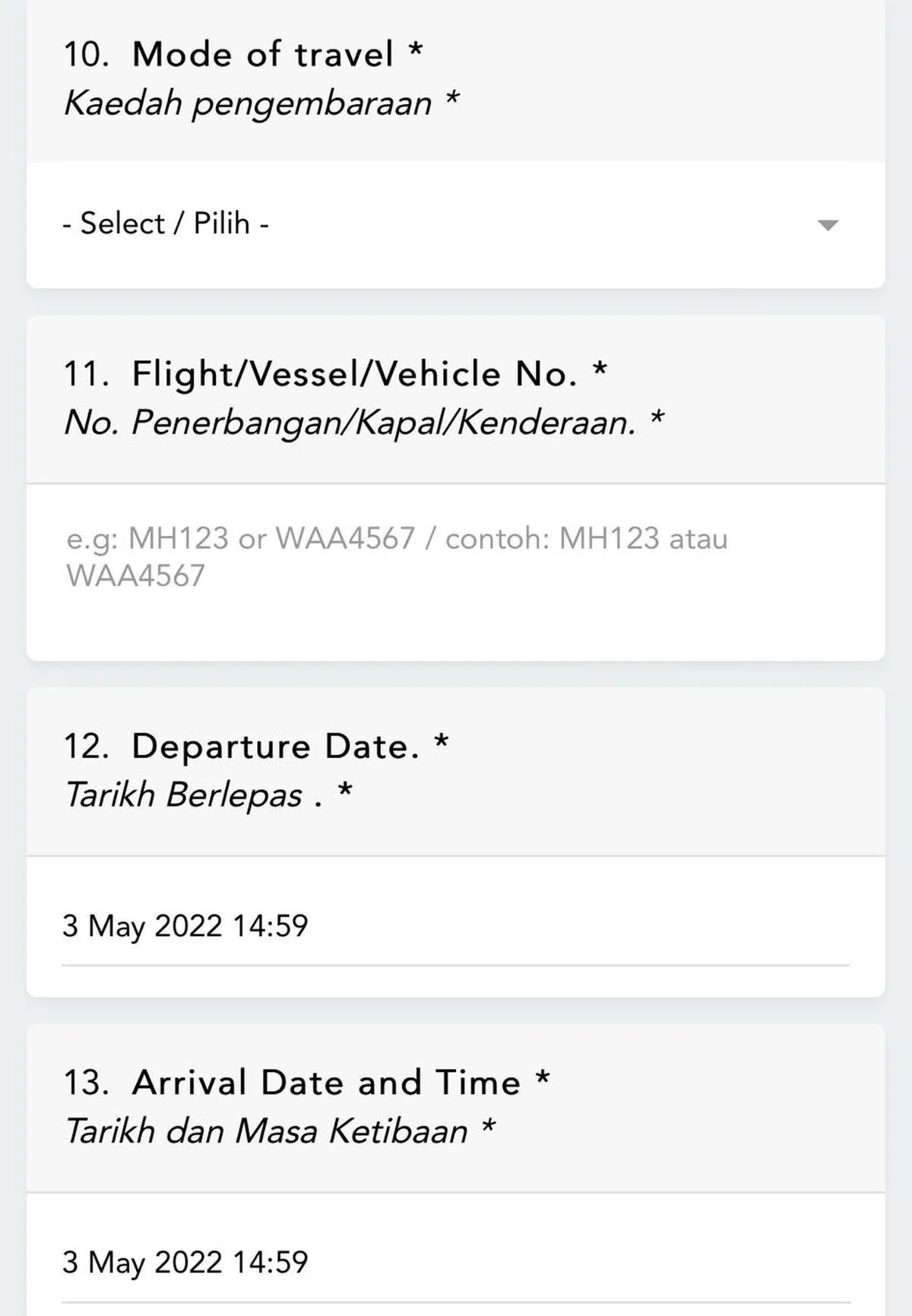6. 接着,回到MySejahtera主页,再次点开”Traveller”页面,选择附有你的名字的Travel For选项,然后再次填妥健康申报表格。这时你会发现有很多“不知道该写什么答案”的问题,例如:乘坐哪种交通工具(须写上车牌号或航班号)、前往哪个州属什么邮编号码、马来西亚的联络地址和电话号码等等。