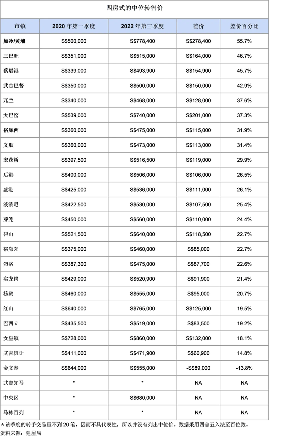 至于四房式组屋单位,中位价涨幅最大的是成熟区——加冷/黄埔,高达55.7%。