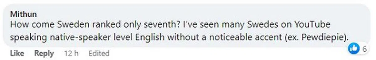 有网民也为瑞典叫屈,认为瑞典只排在第七位令他有些疑惑。毕竟他在网上看过许多瑞典人的视频,他们说的都是一口听得出是母语水平的英语,而且也没有显著的口音。