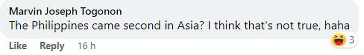 另一方面,有新加坡网民也说,菲律宾排排在亚洲第二也让人难以信服。