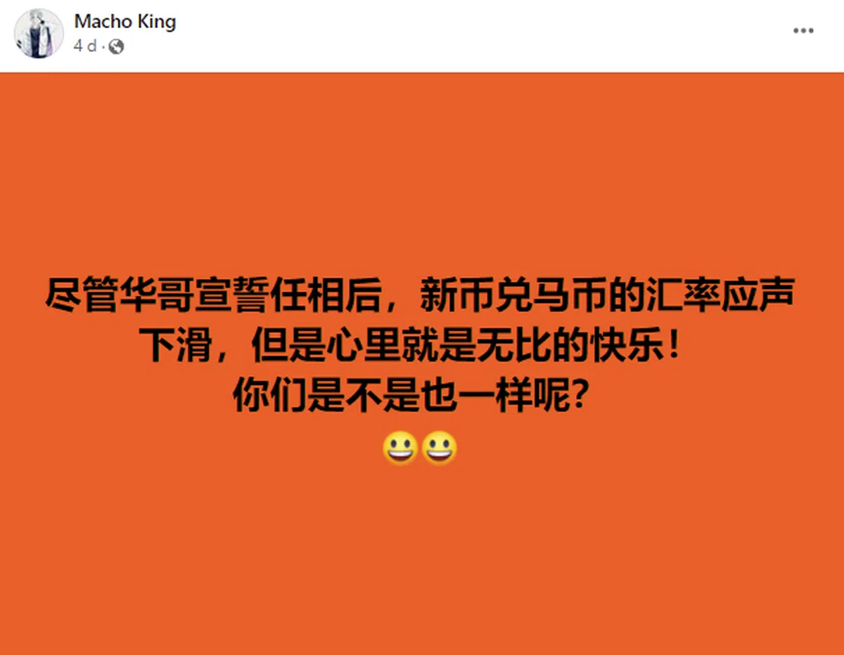 “尽管华哥宣誓任相后,新元兑令吉的汇率应声下滑,但是心里就是无比的快乐!你们是不是也一样呢?”