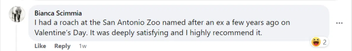 曾经用过这个服务的网民说,多年前在情人节,她也以前任的名字命名了一只蟑螂,让她大快人心,极力推荐大家参加。