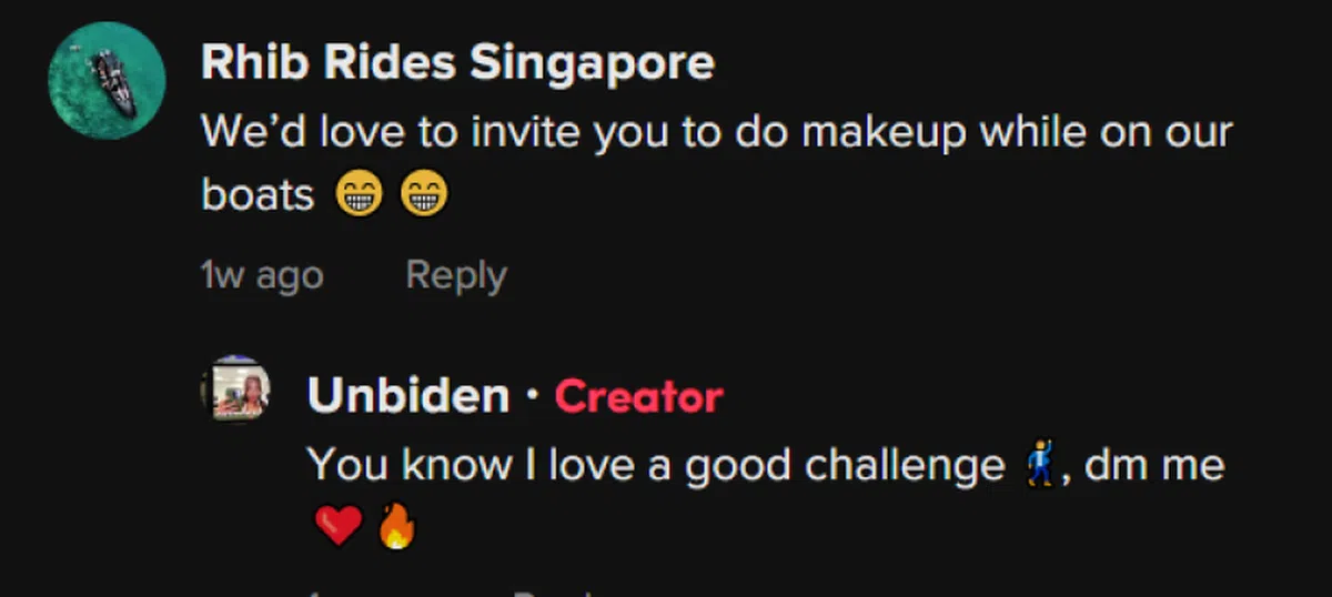 她凭着一手“行走”的化妆技能,引起了本地一间提供游船之旅的快艇公司Rhib Rides Singapore的注意,邀请她在90分钟的快艇之旅上化全妆,也让她的TikTok追随者有机会赢取免费的快艇之旅。