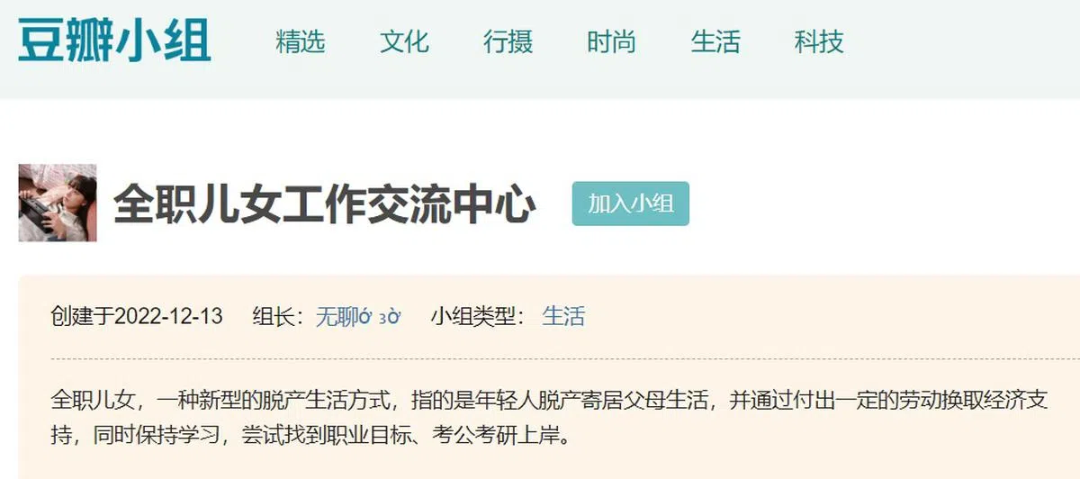 原来,中国社媒豆瓣去年底出现了一个“全职儿女工作交流中心”小组,短短半年就有近4000名成员加入。