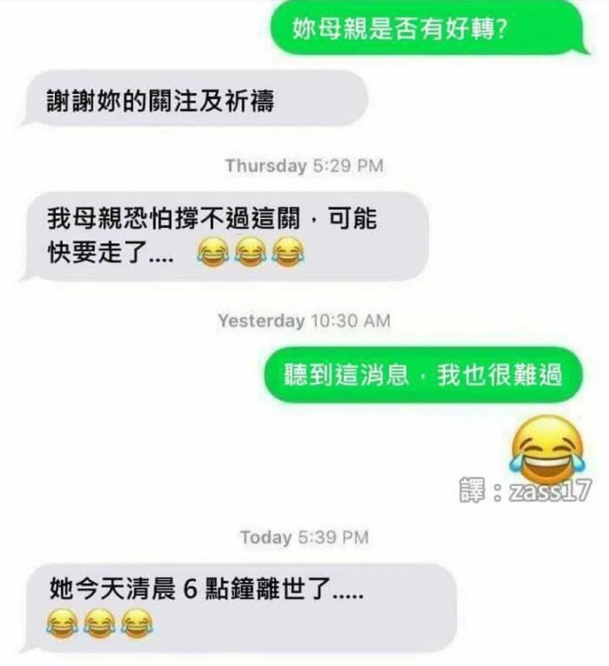 网络上经常有网民分享一些长辈错用表情符号的趣事,例如将哭笑不得(😂)错当哭脸用来表达感伤,于是便出现下列这类令人“哭笑不得”的景象: