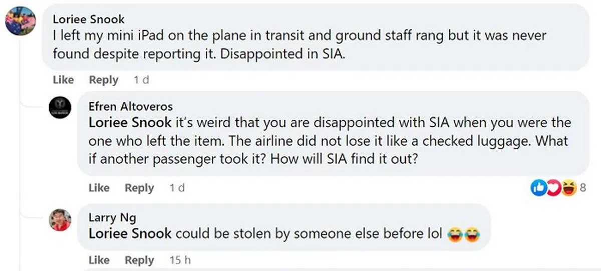 此话一出,就有人回复该网民说,把物品遗落在机上却对新航感到失望,令人无法苟同,况且丢失的物品又不是行李,可能是其他人顺手拿走了,“新航又怎么会查得出来?”