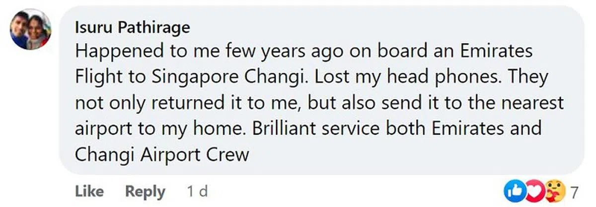 这名外籍旅客说,他几年前乘搭阿联酋航空,入境新加坡后才察觉耳机不见了,但航公公司和樟宜机场的处理方式,让他对他们的服务赞誉有加。