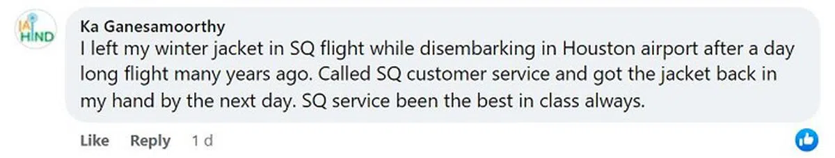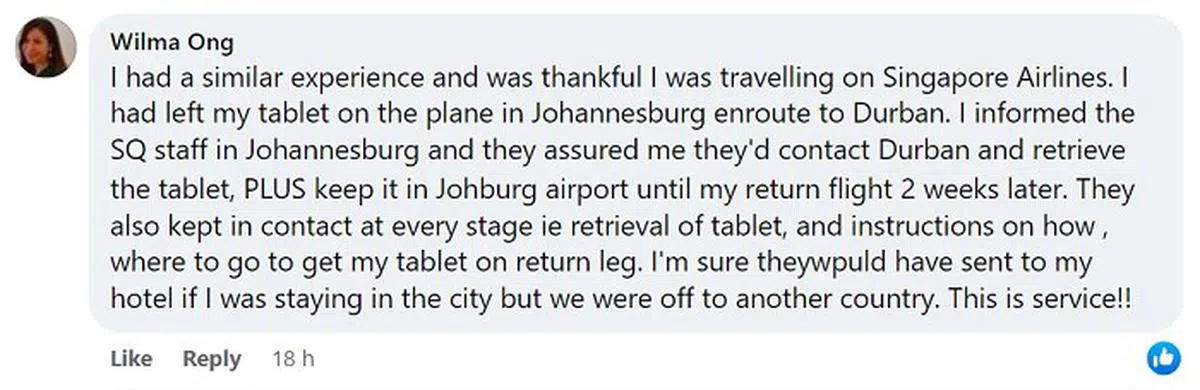 贴文下的留言区也变得十分热闹,其中一部分网民有类似经历,丢失的物品最终能物归原主,也多亏了樟宜机场或新航的协助。