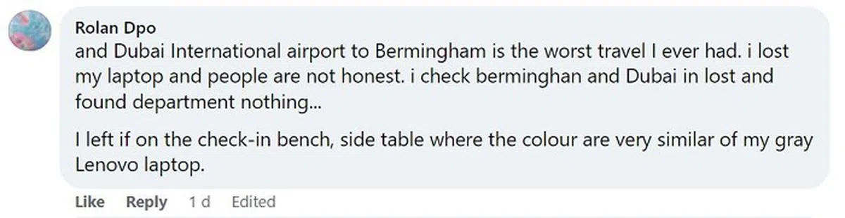 “我的笔电不见了,但他们都很不老实,我询问了迪拜和伯明翰(的机场失物招领处),但却不了了之。”