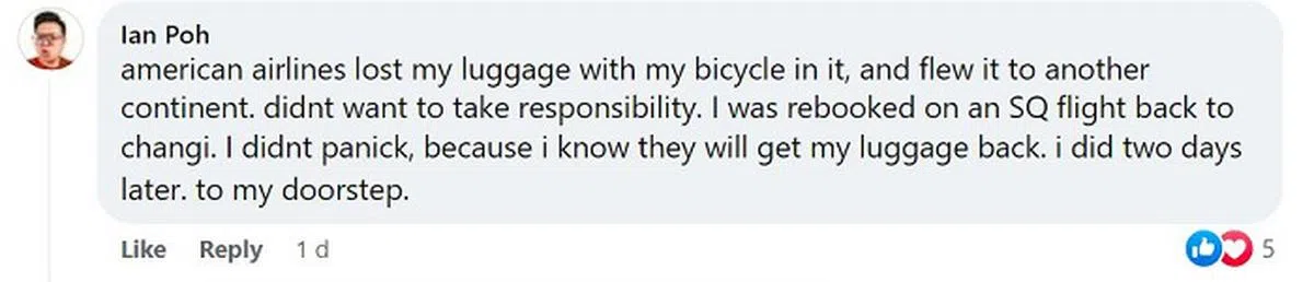 另一名网民说,他某次乘搭美国航空,竟丢失了行李,里头还装有脚踏车。