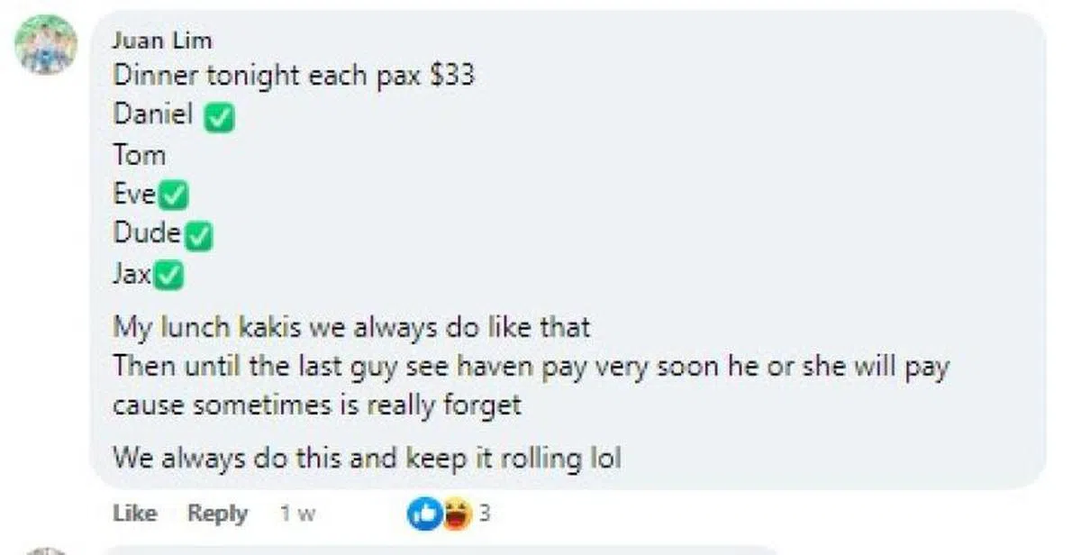 有网民就建议说,可以在WhatsApp群组中发送大家的还钱进度,每人先复制整则简讯,付钱后在自己的名字旁边打上一个勾,再把信息重新发出,还未付钱的人就会频频收到提醒。