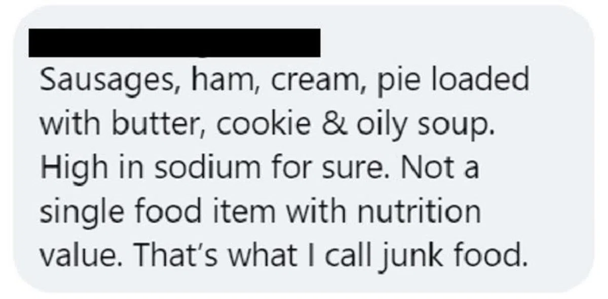 有网民指出,新兵的盘中有香肠、火腿、奶油、加满牛油的馅饼、饼干,以及油腻的汤,想必吃这么一餐盐分偏高,也没有任何一样食物有营养价值,感觉都是“垃圾食物”。