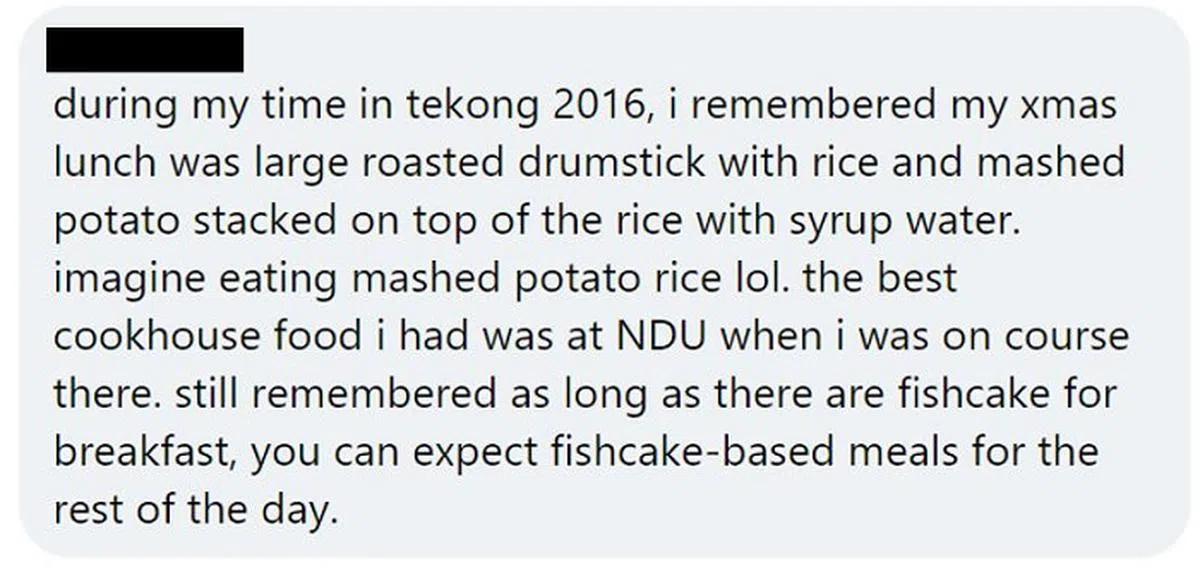 另一位比较“近代”的网民说,2016年服役期间吃过圣诞节午餐,有白饭配一大只烤鸡腿、糖浆饮料,不过最令他难以忘怀的是将薯泥盖在白饭上面所制造出来的“薯泥饭”。