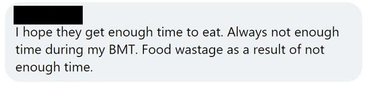 让另一位网民感到好奇的是,新兵是否有足够的时间用餐。他说,自己当年在接受基本军训期间,总是没有足够的时间吃饭,结果吃不完造成浪费食物。