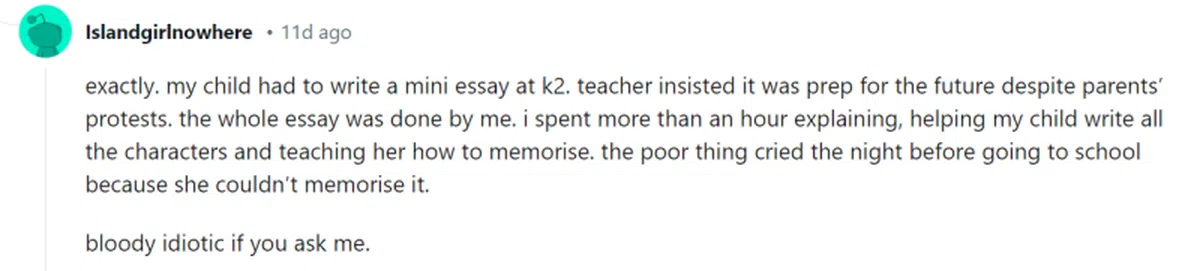 有家长更说,孩子的学校不仅有听写,还得以华语写一篇短文。显然孩子写不出来,整篇文章都是她代为构思。接着还得跟孩子解释,教孩子写出来,让孩子背起来,整个过程花上一个多小时,可怜的孩子都学哭了,因为实在记不住。