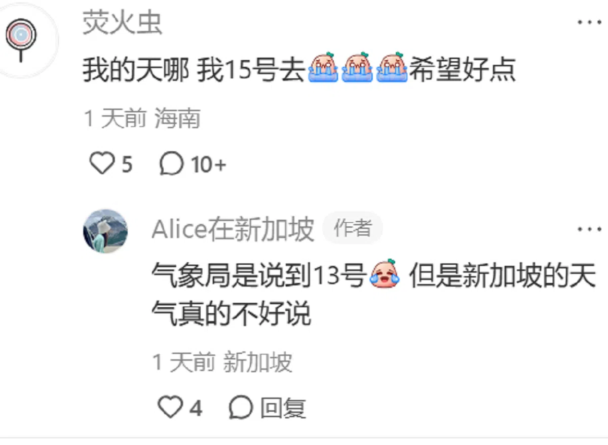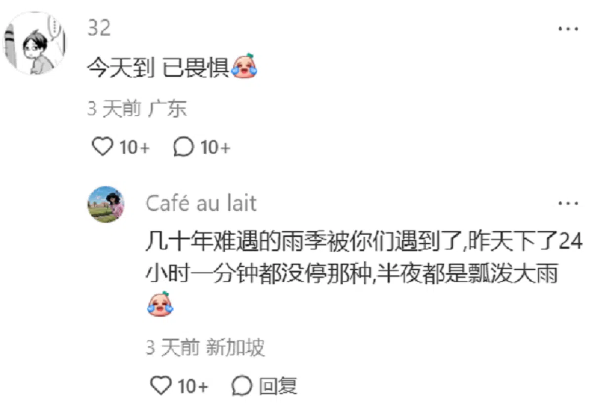 有一名在10日抵达新加坡的广东游客在小红书上挂了几段“雨下不停”的短视频写道: