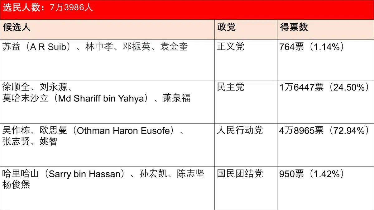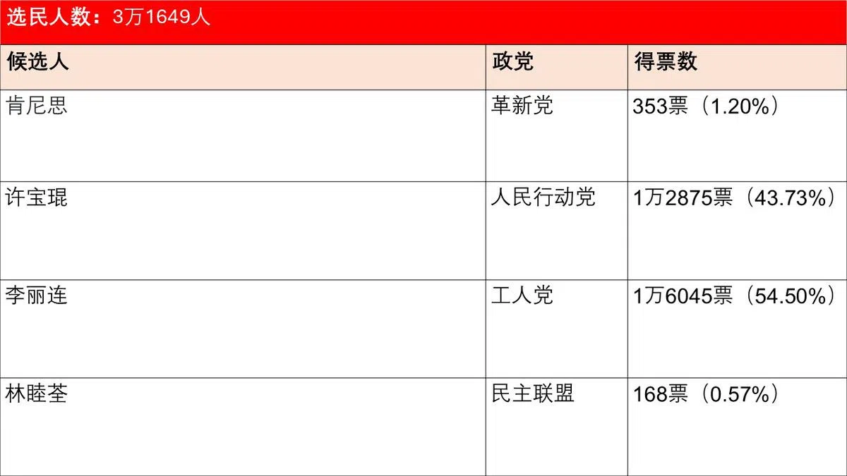 人民行动党派出“榜鹅之子”许宝琨出战,但仍不敌工人党候选人李丽连,后者以54.50%的选票击败其他三名候选人。