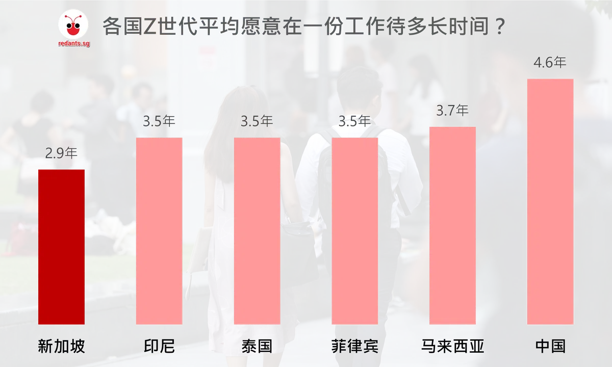 调查显示,新加坡Z世代平均只愿意在一份工作待2.9年,为六国Z世代中最短。 相较之下,印尼、泰国和菲律宾的Z世代平均皆愿意在一份工作待3.5年、马来西亚3.7年、中国4.6年。