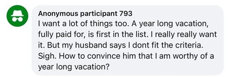 更有网友用同样“文体”打趣道,她也有自己想要的东西,排在第一位的就是一年全额报销的长假。不过,她的丈夫却认为她不符合资格,她该找谁求助,才能让丈夫觉得她值得去这趟长假呢?