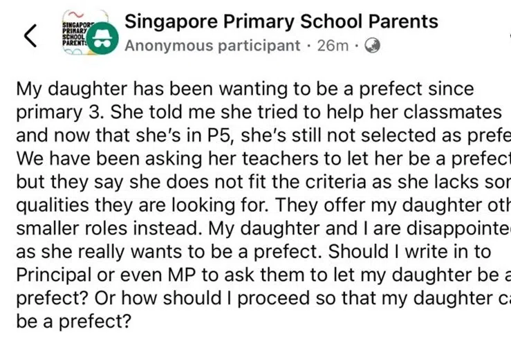 一名新加坡家长昨晚(9月22日)在脸书群组“Singapore Primary School Parents”匿名发帖,分享了她小学五年级女儿的心愿:自小学三年级起,她就一直想当巡察员(prefect)。