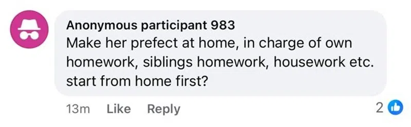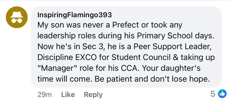 有一名网友以自己孩子为例,说明有些孩子属于“起步晚的人”。他的孩子小学时并没有当上巡察员或任何学生领袖职位,但到了中三,已经担任同伴辅导领袖、学生会纪律委员会成员,还在课外活动中担任经理角色。他提醒贴文家长说: