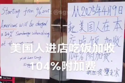 牛车水中餐馆贴“美国人加收104%附加费”告示 是实锤还是恶搞?