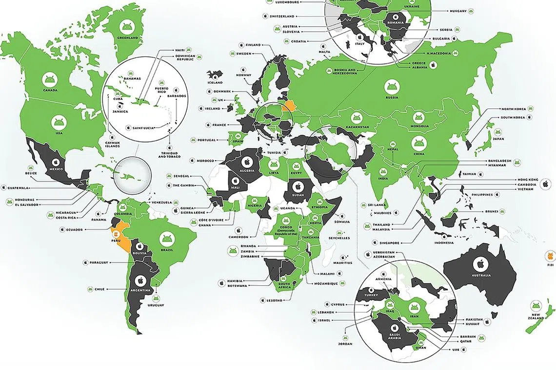苹果VS安卓:摊开世界地图,哪款手机最受人们青睐?