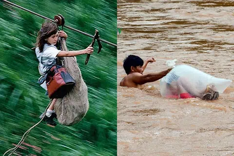 装进塑料袋里渡河 攀爬3小时天梯 这些上学的路是你没想过的