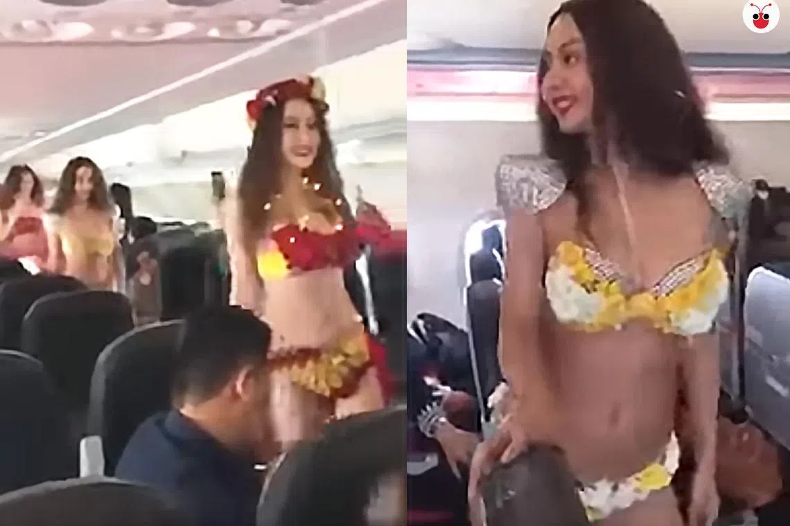 只见身材妙曼的美女各个穿着比基尼,敏感部位挂上一朵朵的花,在狭窄的机舱走道上走起猫步来。