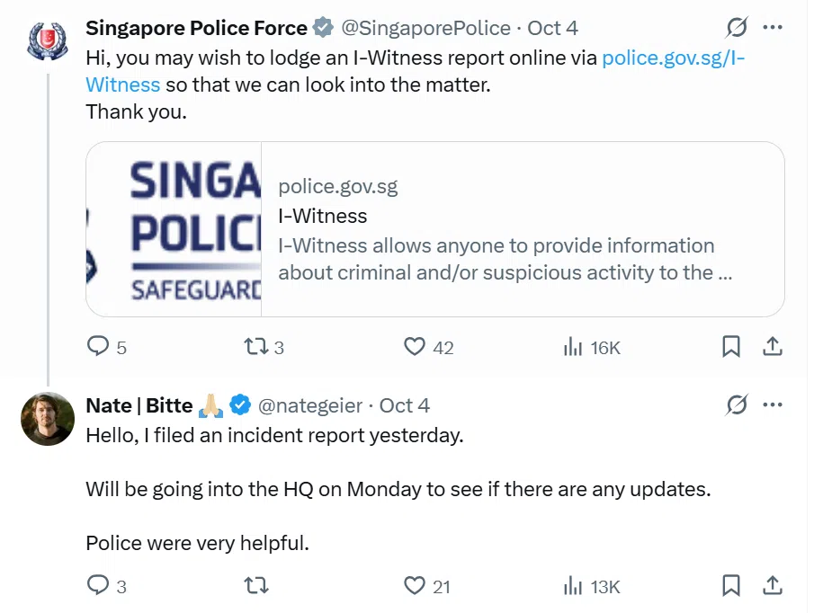 此事自然引起新加坡警方的关注。警方在Nathanael的帖子下留言,建议他通过线上平台备案,以便展开调查。