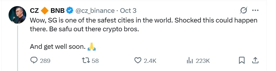 Nathanael 说自己在10月2日晚上11点左右,参加完Token2049后,从会场步行回酒店时突然被袭击(jumped)打晕,醒来时人已在医院,护照和戒指均不翼而飞。