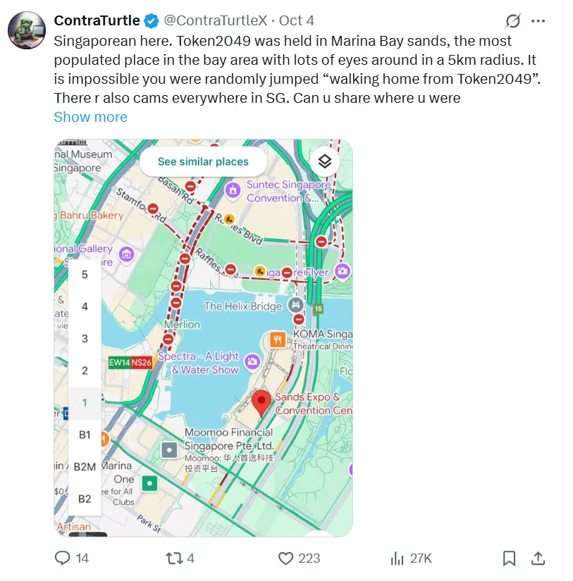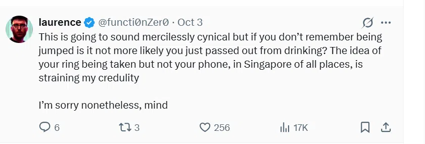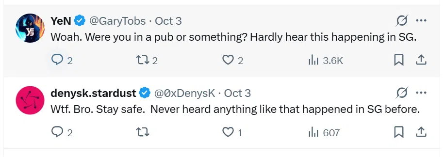 尽管 Nathanael 并未透露事发地点,但网友指出,滨海湾金沙酒店及新加坡各处均设有大量监控摄像头,发生突袭事件的可能性极低。