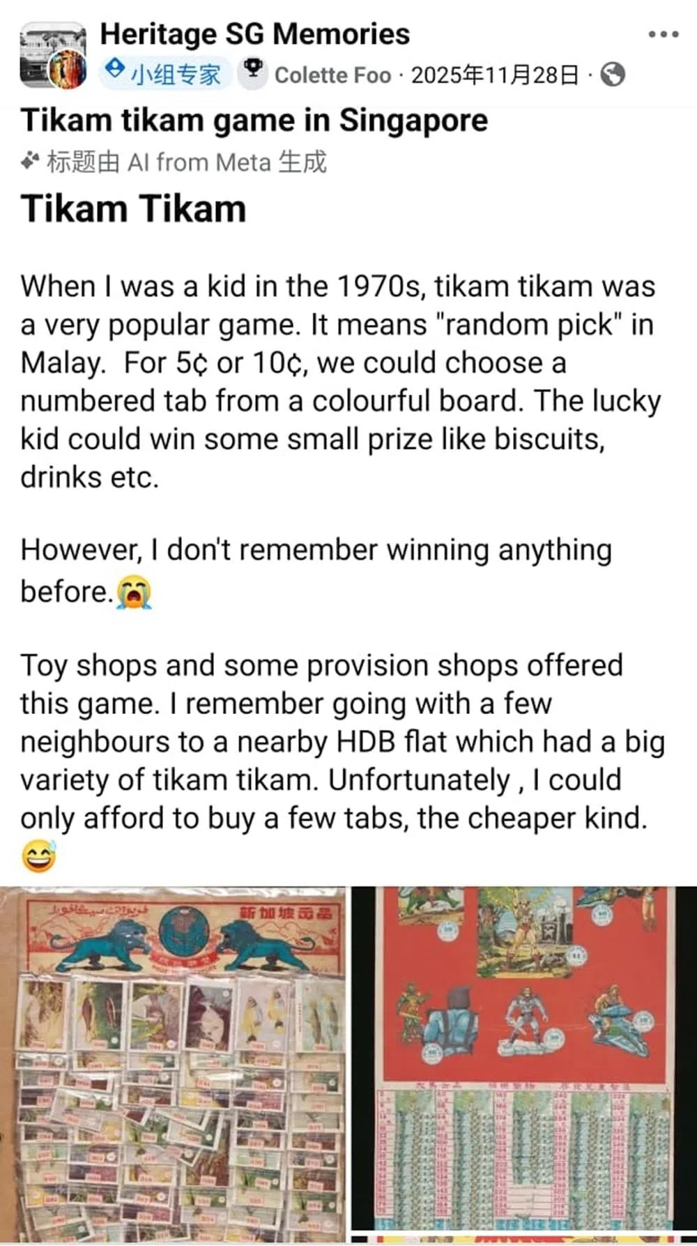 一名网友Colette Foo在脸书回忆,tikam tikam在1970年代非常流行,当时一些玩具店和杂货店甚至会摆出一整面“奖品墙”,让孩子看得眼花缭乱。