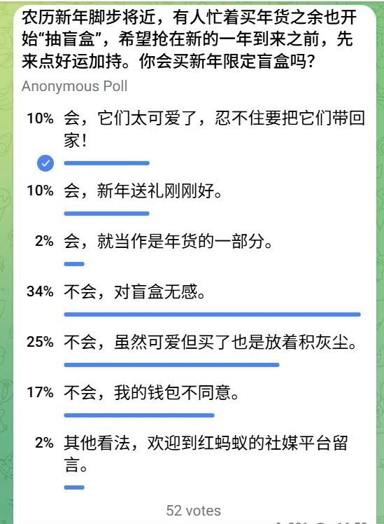 投票结果显示,高达77%表示不会,其中35%坦言对盲盒无感。看来,大多数蚁粉都属于理智消费派。