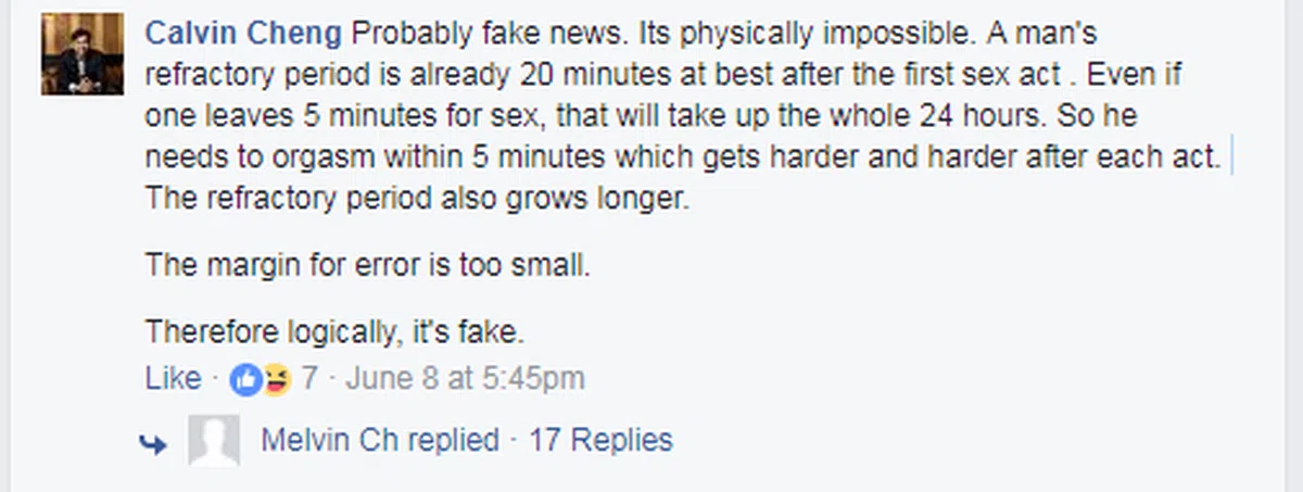 Calvin Cheng网友说:“这应该是一则假新闻,因为体能上根本做不到。任何一名男子在进行性交后的修复期最快是20分钟。要在24小时内与57名女子性交并射精,与每名女子只有5分钟的性交时间。换句话说,他必须在这5分钟内就达到高潮射精,这种难度是一次比一次困难,而且修复期会越变越长。整个过程中允许出错的可能性实在过于微小,所以按逻辑来说,这是假的。”