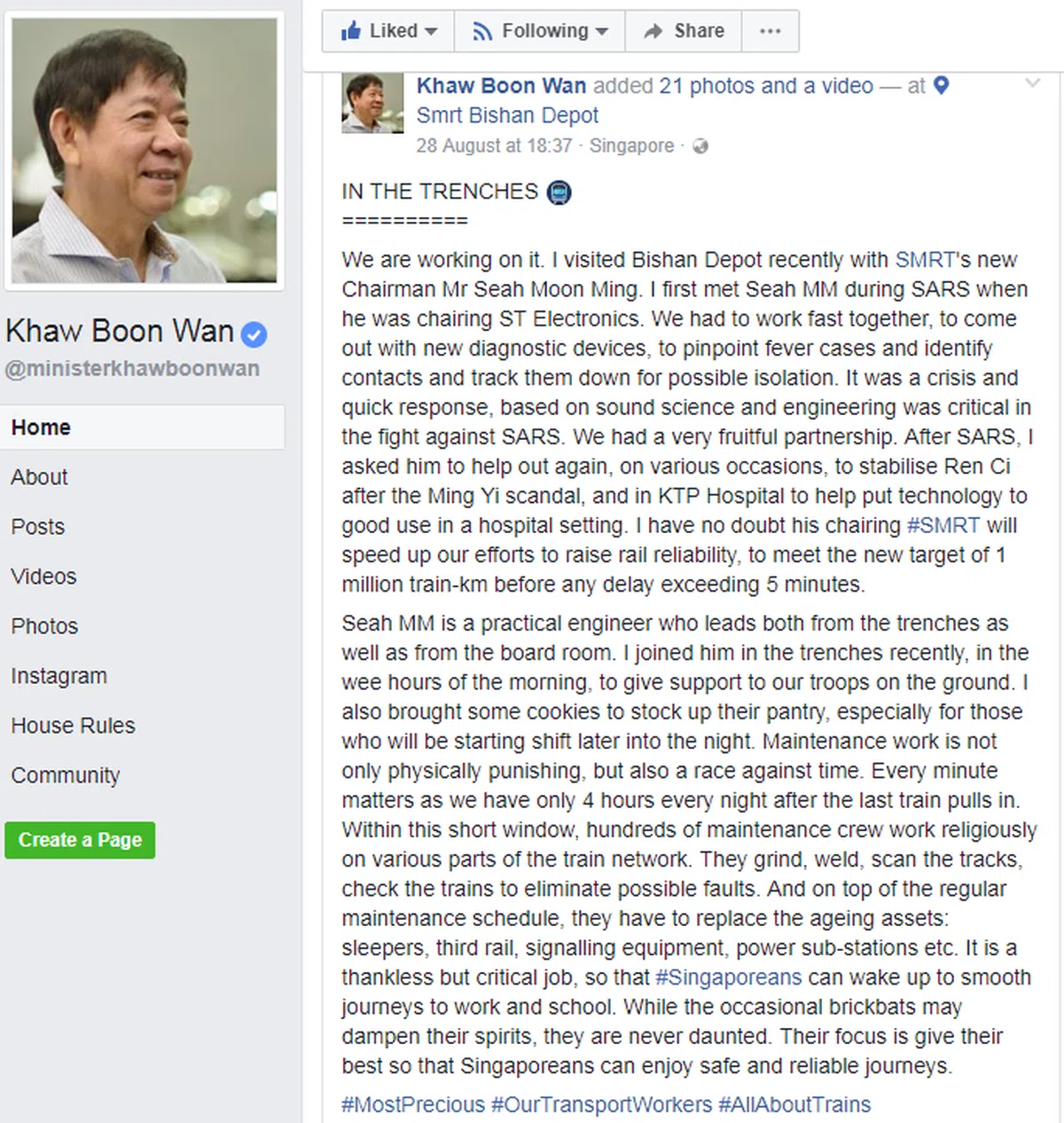 就在前天(28日),新加坡交通部长许文远先生在他的面簿上发表了一则参观了碧山地铁车库的消息,并表示,“We are working on it(我们正在努力).” 他还表示,SMRT的新主席佘文民曾经在SARS期间立下汉马功劳,同时在“仁慈医院”发生挪用善款的丑闻后,帮忙仁慈医院渡过难关。因此,在佘文民的带领下,他有信心地铁故障能够解决。与此同时,许文远还解释道,维修人员每个晚上在最后一班列车停驶之后,只有4个小时的时间维修,与时间赛跑的难度还是不小。