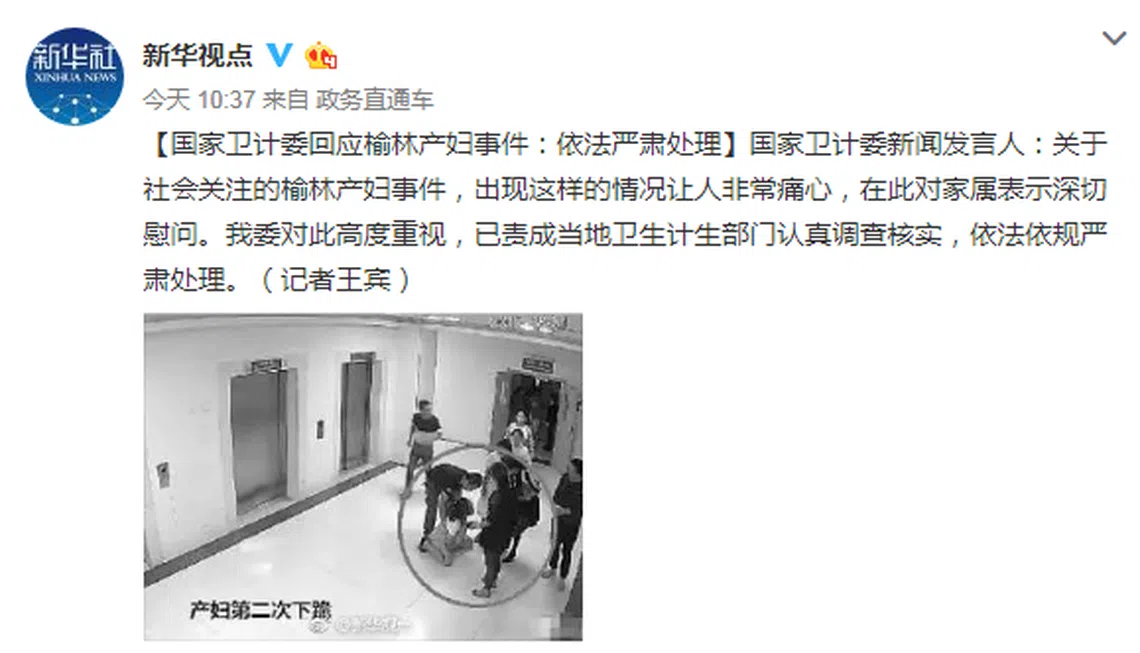 中国陕西省榆林市8月31日晚上发生的产妇坠楼惨死事件,引起中国社会的高度关注与网民的热议,中国国家卫生和计划生育委员会新闻发言人7日终于对此事作出回应说:“关于社会关注的榆林产妇事件,出现这样的情况让人非常痛心,在此对家属表示深切慰问。我委对此高度重视,已责成当地卫生计生部门认真调查核实,依法依规严肃处理。”