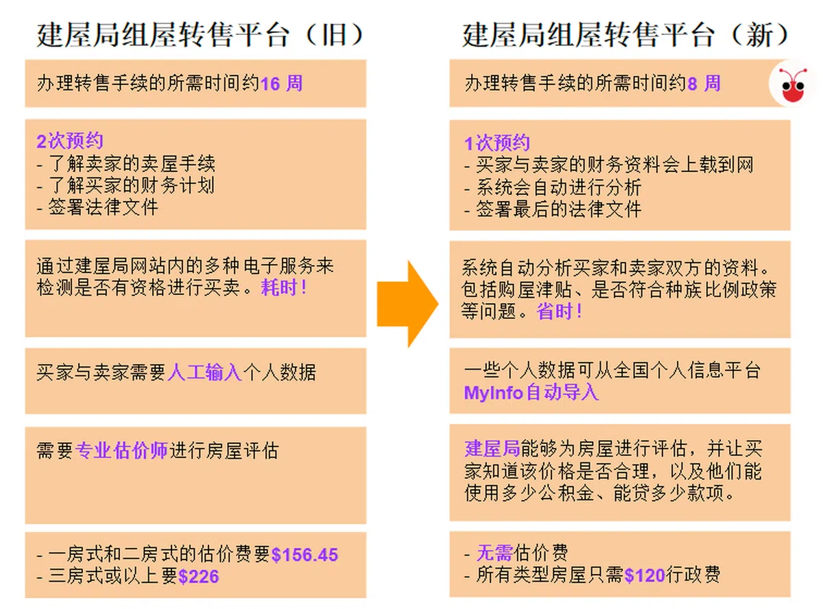 新的平台简化了一系列组屋转售手续程序,买卖双方今后只需亲临建屋局一次,在两个月内就能完成转售组屋的手续,时间足足缩短了一半。以往原本需要人工运作的程序几乎都改成自动化。政府部门速度加快了,买方卖方开心了,可房屋中介和专业估价师却快失业了。