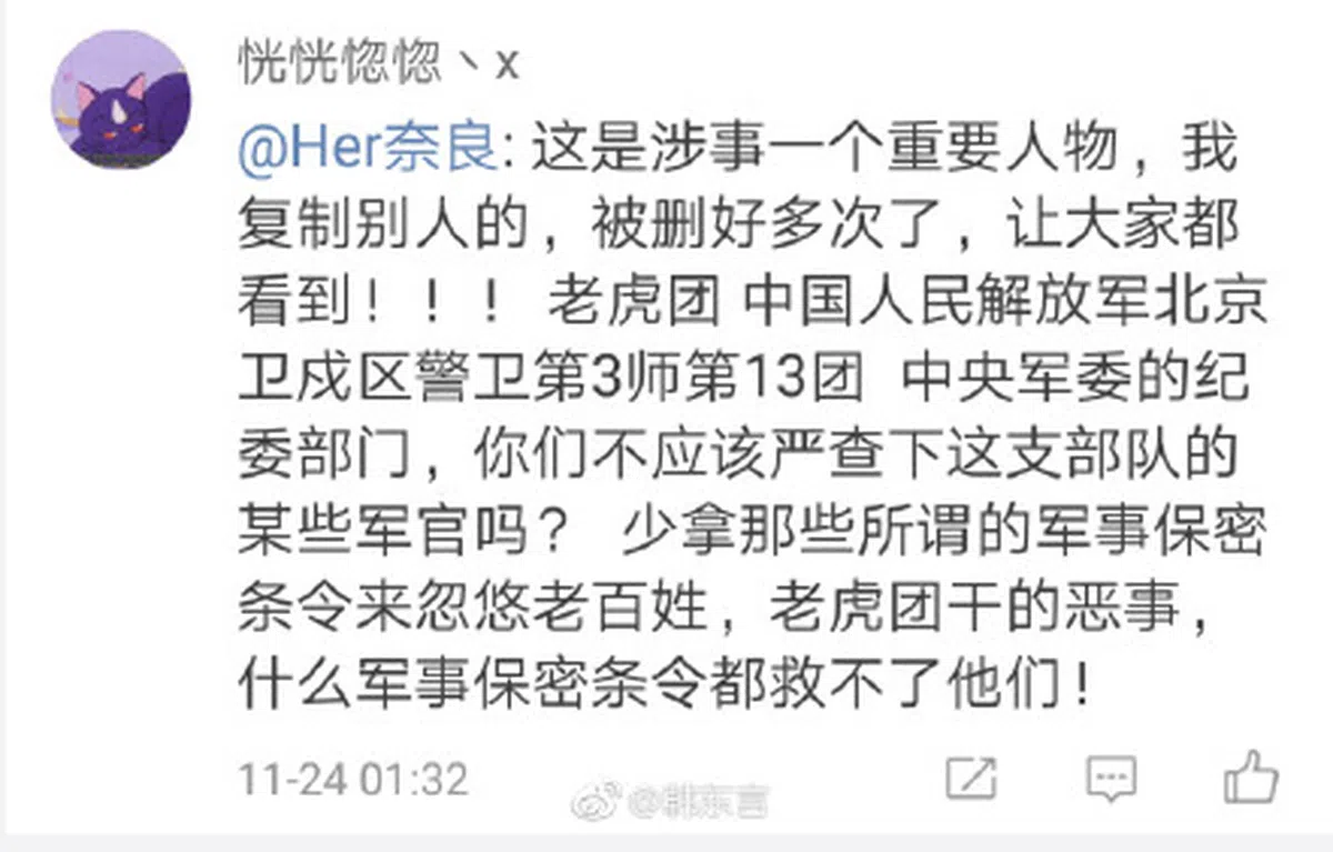 也有网友转发“耸动性”的言论称,传闻中的虐童事件涉及一个俗称“老虎团”的解放军警卫第3师警卫第13团。
