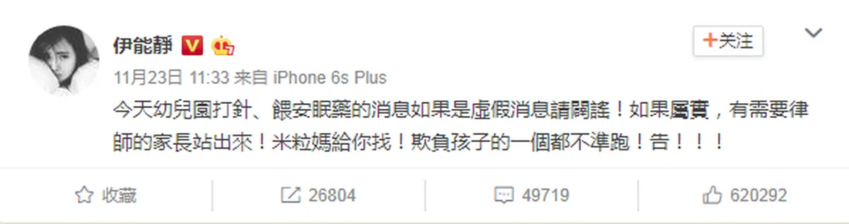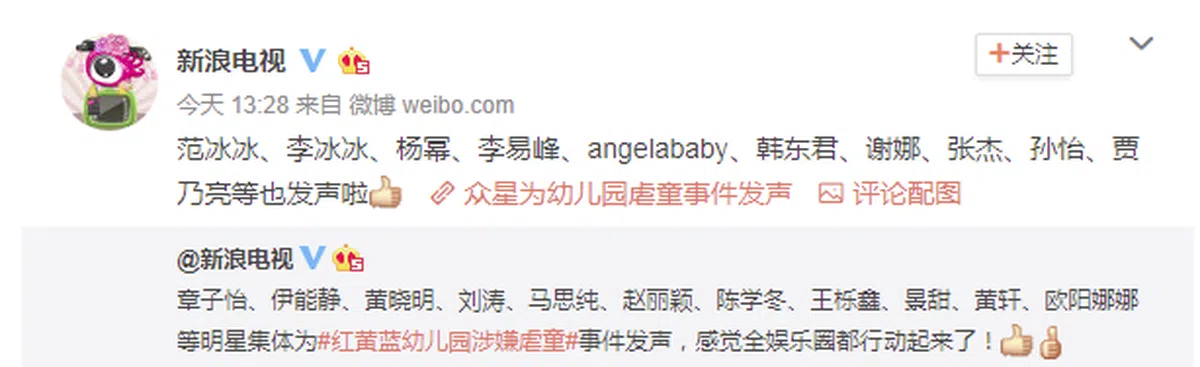不过,这起事件已如雪球越滚越大,孩子的描述、部分曝光照片、家长的控诉不断刷屏。中国演艺圈有孩子没孩子的艺人,包括范冰冰、杨幂、黄晓明和章子怡等人,也各自靠着他们的粉丝力量,在微博出面发声: