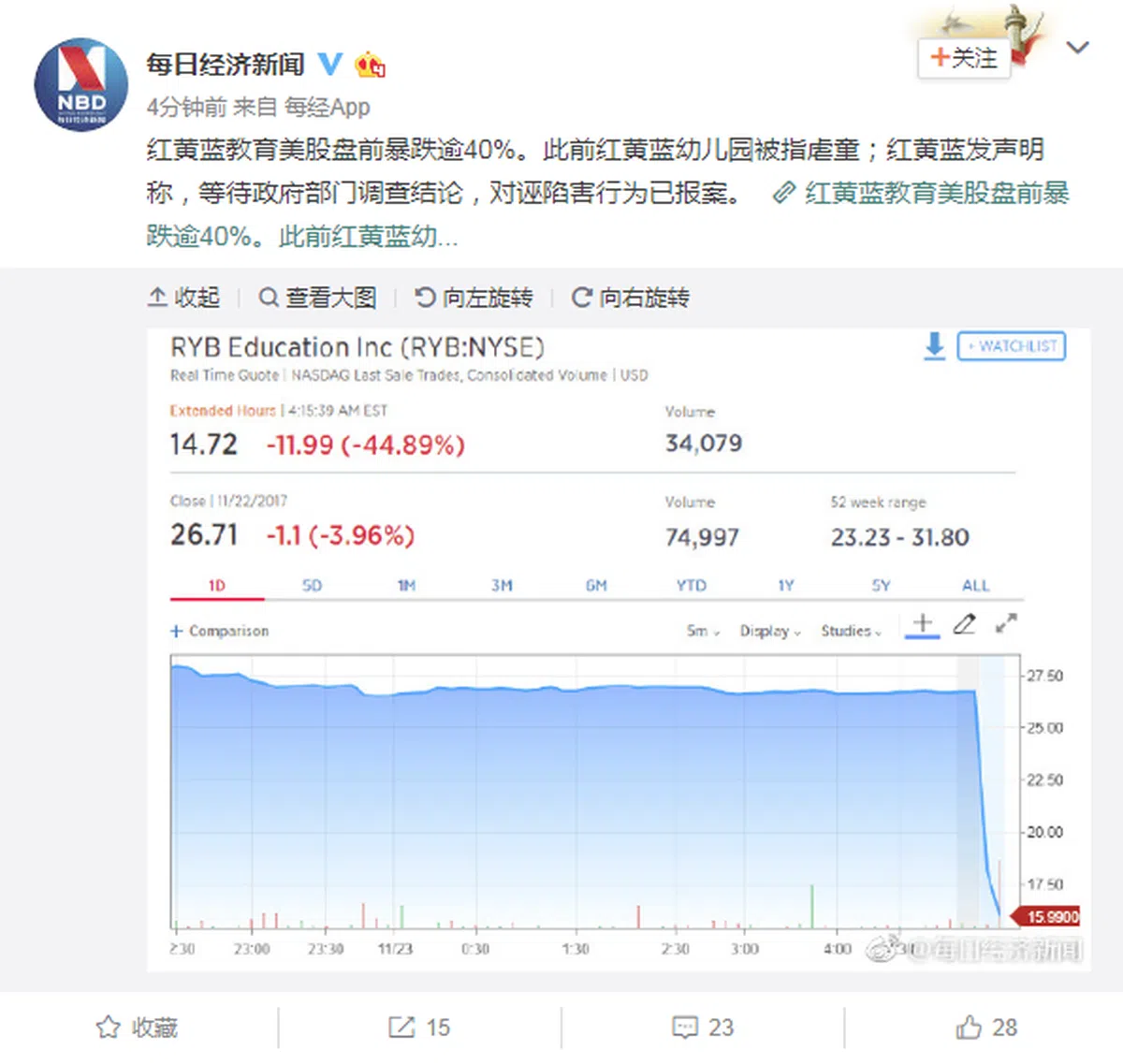 不过,在有关虐童的传闻曝光后,每日经济新闻今天报道称,红黄蓝教育美股盘前暴跌逾40%。