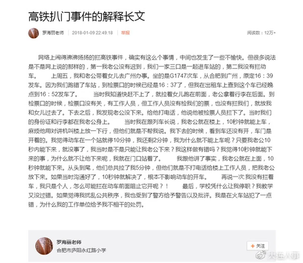 10日,罗某在网络发文抗议学校无权让她停职 ,她说:“我教学又没过错……我是在火车站犯了一点错,为什么我的工作单位给予我不相干的处罚。”她还声称,那列高铁原本就已经将发车时间调晚13分钟,自己并没有延误高铁发车。