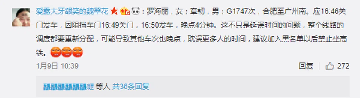 也有网民直接将其个人资料人肉了出来,并建议将其加入黑名单,以后禁止乘坐高铁: